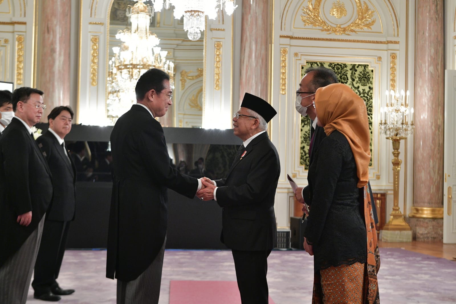 Usai menghadiri prosesi pemakaman kenegaraan Mantan Perdana Menteri (PM) Jepang Shinzo Abe di Nippon Budokan, Wakil Presiden (Wapres) K.H. Ma’ruf Amin menghadiri Greetings Occasion untuk menyampaikan ucapan duka cita secara langsung kepada PM Jepang Fumio Kishida dan istri mendiang Mantan PM Shinzo Abe, Akie Abe di Istana Akasaka, Tokyo, Selasa (27/09/2022). (Foto: BPMI Setwapres)
