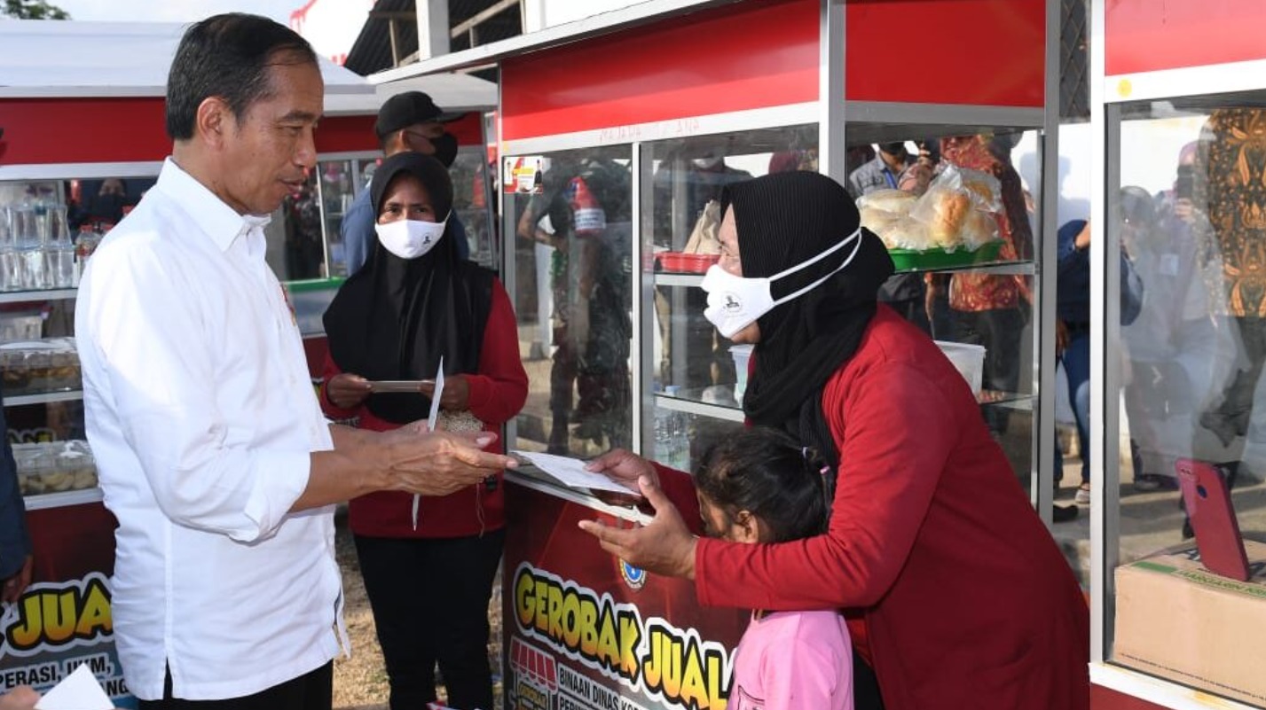 (Vibizmedia-Nasional) Presiden Joko Widodo menyerahkan Bantuan Modal Kerja (BMK) kepada para pedagang kaki lima dan pedagang pasar rakyat Bandar Batauga, Kabupaten Buton Selatan, pada Selasa sore, 27 September 2022.