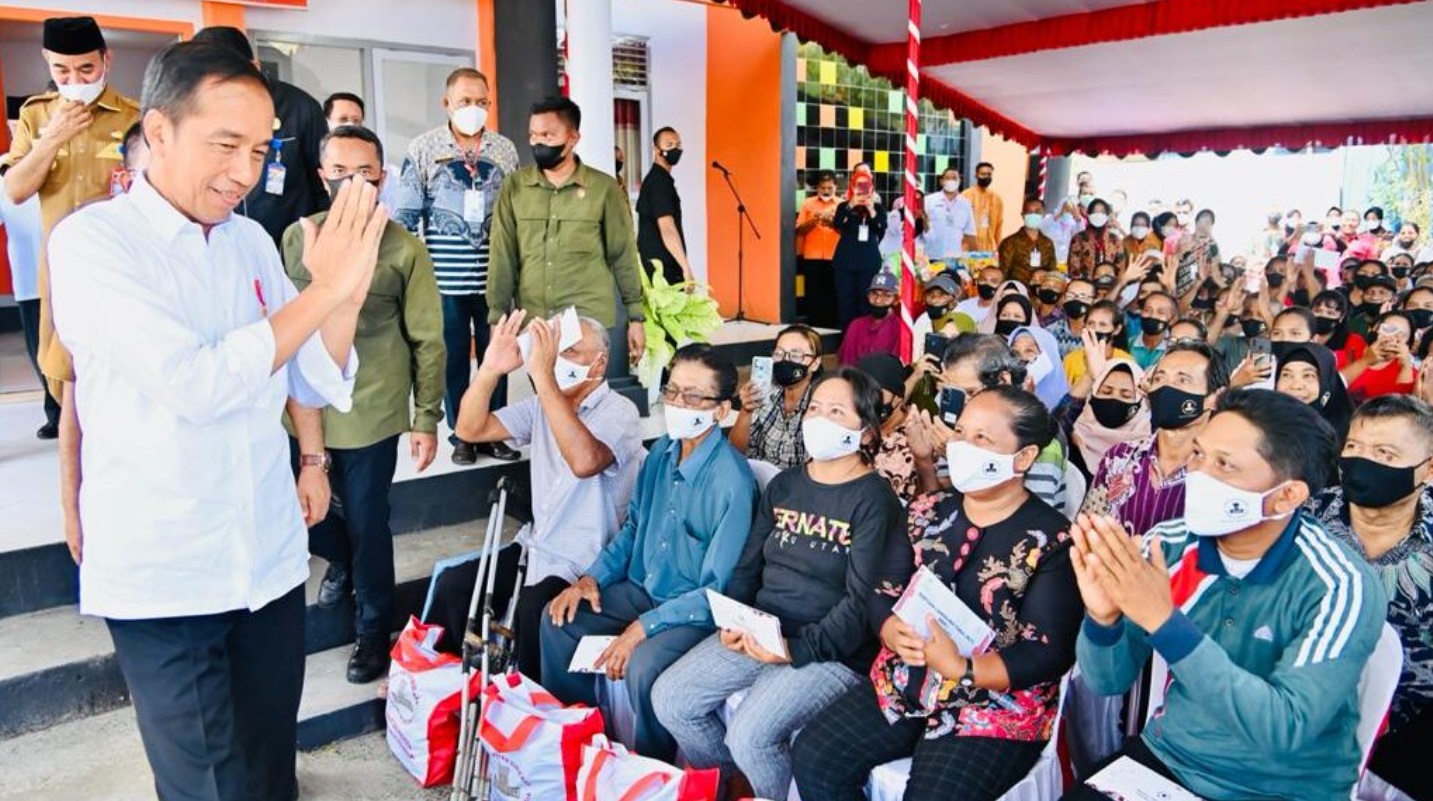 (Vibizmedia-Nasional) Presiden Joko Widodo menyerahkan sejumlah bantuan sosial berupa bantuan masyarakat dari Presiden sebesar Rp1,2 juta, bantuan langsung tunai bahan bakar minyak untuk bulan September dan Oktober sebesar Rp300 ribu dan bantuan sembako di Kantor Pos Jailolo, Kabupaten Halmahera Barat, Provinsi Maluku Utara, pada Rabu, 28 September 2022.
