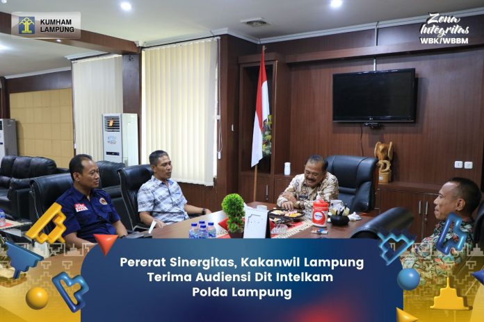 (Vibizmedia – Lampung) LAMPUNG_INFO – Kepala Kantor Wilayah Kementerian Hukum dan Hak Asasi Manusia Lampung, Edi Kurniadi; dan Kepala Divisi Imigrasi, Isedy Eko Putranto; menerima Audiensi dari Kepala Subdit Keamanan Negara Dit Intelkam Polisi Daerah (Polda) Provinsi Lampung yang bertempat di Ruang Kerja Kakanwil.