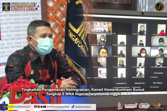 (Vibizmedia – Sumut) Medan – Tangkap 6 Warga Negara Asing Nigeria tanpa izin tinggal, Divisi Keimigrasian Kantor Wilayah Kementerian Hukum dan HAM Sumatera Utara terus berusaha tingkatkan pengamanan keimigrasian di Provinsi Sumatera Utara. Hal ini sebagaimana disampaikan oleh Kepala Bidang Intelijen dan Penindakan Keimigrasian, Gelora Adil Ginting, dalam amanatnya selaku Pembina Apel hari ini. Kamis, (29/09/2022).