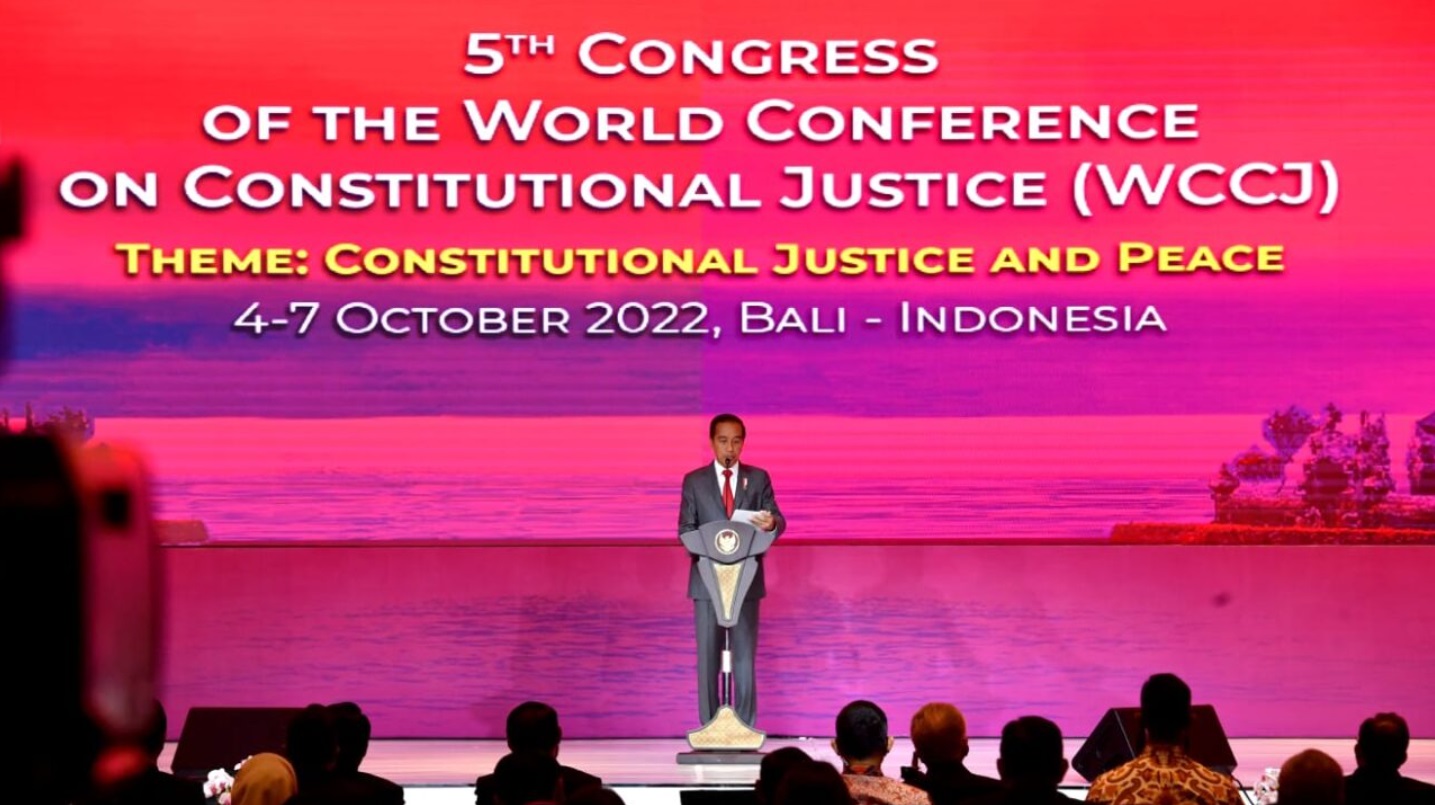 “Namun, tugas Bapak, Ibu, Yang Mulia hakim konstitusi, dan juga tugas kita bersama saat ini makin sulit dan makin berat. Selain menegakkan constitutional justice, semua negara di dunia saat ini harus menangani beberapa krisis,” ungkap Presiden saat membuka Kongres ke-5 Konferensi Badan Peradilan Konstitusi Sedunia atau The World Conference on Constitutional Justice (WCCJ) Tahun 2022 yang digelar di Bali Nusa Dua Convention Center (BNDCC), Kabupaten Badung, Provinsi Bali, pada Rabu, 5 Oktober 2022.