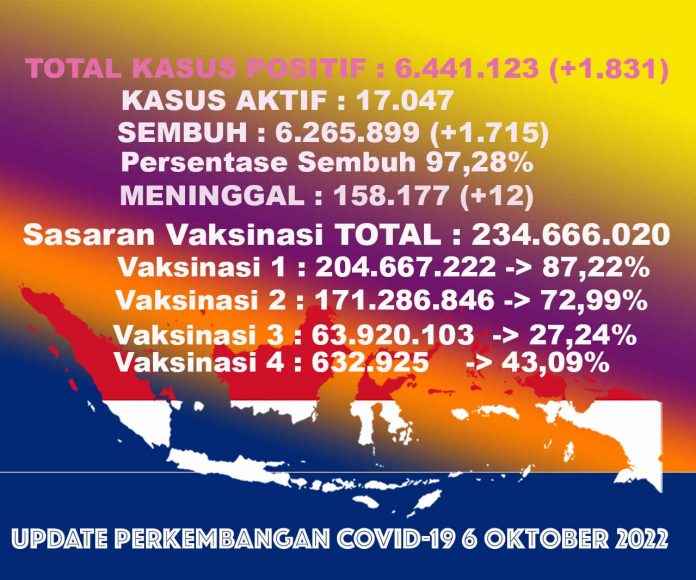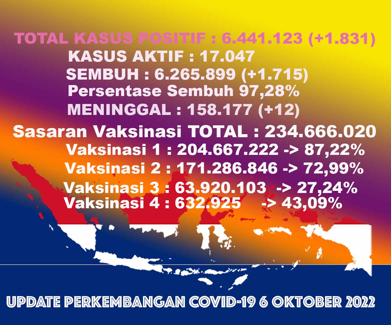 (Vibizmedia – Nasional) Berikut adalah angka akumulatif perkembangan data kasus Covid-19 dari seluruh Indonesia hingga tanggal 6 Oktober 2022.