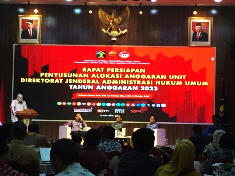 Rapat Persiapan Penyusunan Alokasi Anggaran Unit Direktorat Jenderal AHU TA 2023 dilaksanakan di Hotel JS Luwansa, Jakarta, Kamis (6/10/2022). Plh Kepala Divisi Pelayanan Hukum dan HAM Kanwil Kemenkumham DIY Mutia Farida hadir dalam kegiatan tersebut.
