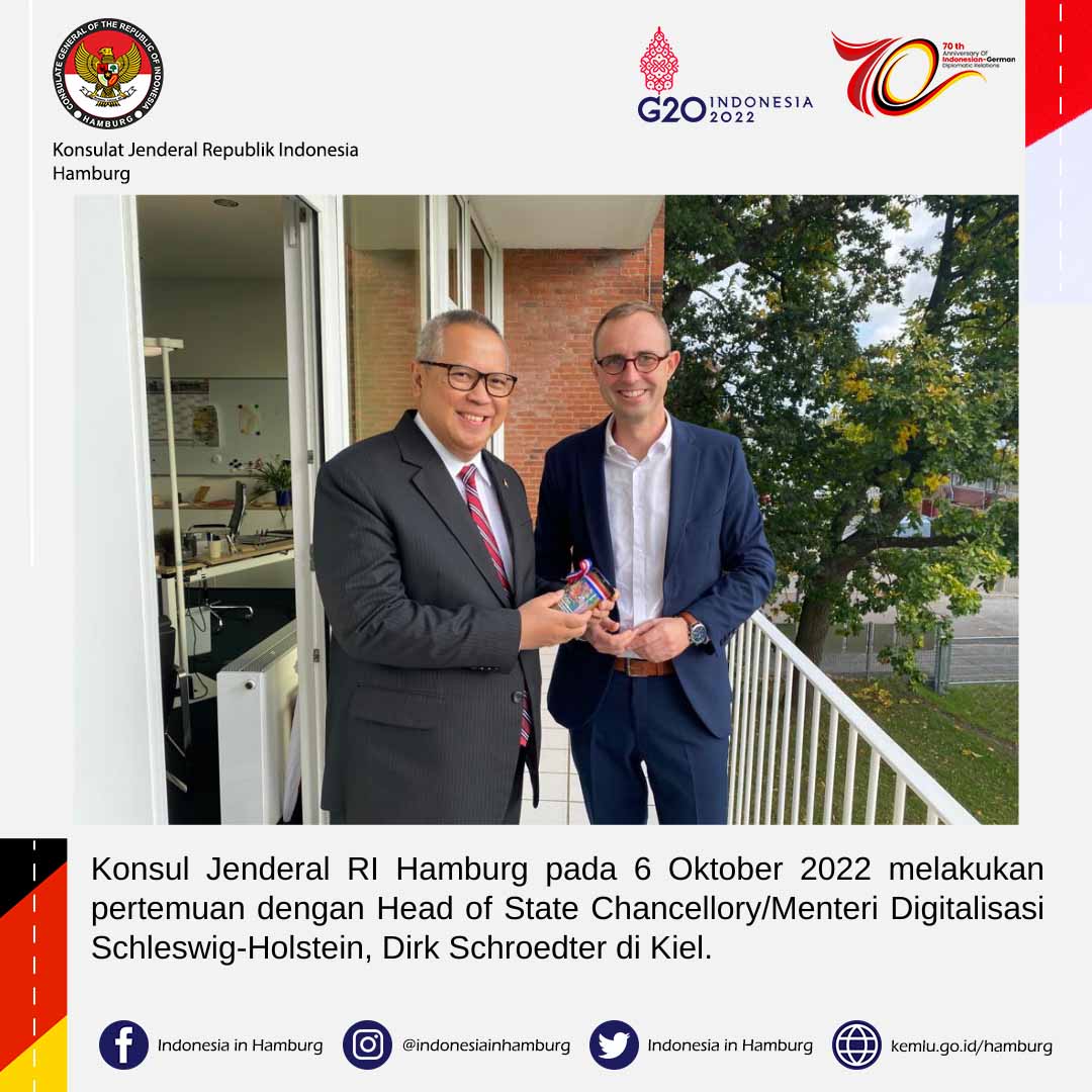 Vibizmedia – Kiel, Jerman) Konsul Jenderal RI Hamburg telah melakukan pertemuan dengan Dirk Schroedter, Menteri/Head of the State Chancellory Schleswig-Holstein di Kiel (06/10/2022) dengan tujuan mempromosikan kerja sama energi baru dan terbarukan serta kerja sama strategis di bidang lainnya.