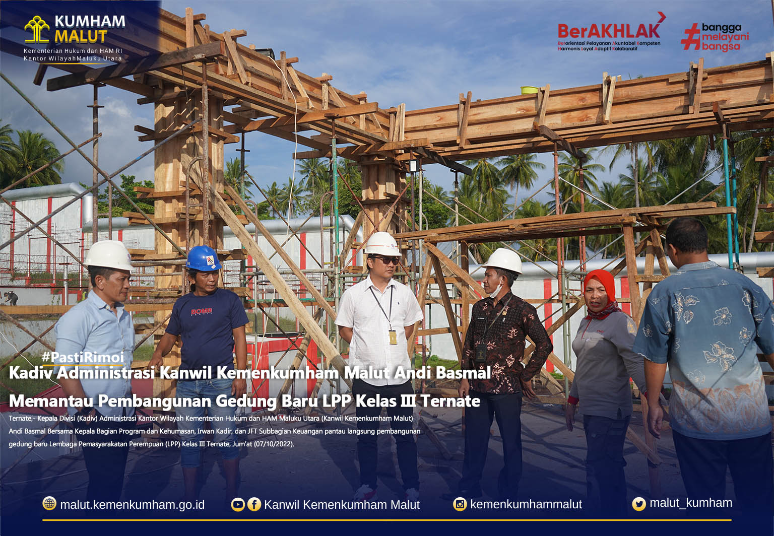 (Vibizmedia – Malut) Ternate,- Kepala Divisi (Kadiv) Administrasi Kantor Wilayah Kementerian Hukum dan HAM Maluku Utara (Kanwil Kemenkumham Malut) Andi Basmal Bersama Kepala Bagian Program dan Kehumasan, Irwan Kadir, dan JFT Subbagian Keuangan pantau langsung pembangunan gedung baru Lembaga Pemasyarakatan Perempuan (LPP) Kelas III Ternate, Jum’at (07/10/2022).
