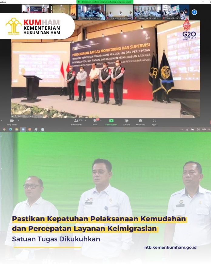 (Vibizmedia – NTB) ntb.kemenkumham.go.id – Kepala Kantor Wilayah Kemenkumham NTB, Romi Yudianto, mengikuti kegiatan Pengukuhan Satuan Tugas Monitoring dan Supervisi Terhadap Kepatuhan Pelaksanaan Kemudahan dan Percepatan Layanan Visa, Izin Tinggal dan Dokumen Keimigrasian Lainnya Guna Mendukung Peningkatan Investasi Asing dan Devisa dari Sektor Pariwisata, yang dilaksanakan secara hybrid oleh Direktorat Jenderal Imigrasi pada Rabu (05/10).