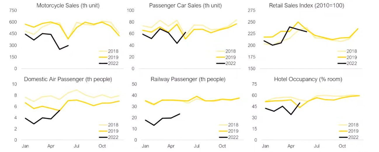 Di dalam negeri, kendala pasokan mendorong inflasi lebih tinggi. Peningkatan inflasi Indonesia baru-baru ini terkait dengan curah hujan yang lebih tinggi (mengganggu panen beberapa bahan makanan seperti cabai merah dan menambah tekanan pada harga pakan ternak) dan pembukaan kembali ekonomi yang bertepatan dengan masa liburan (misalnya, tiket pesawat). Namun demikian, perang di Ukraina menambahkan dampak yang meningkat tetapi terbatas pada harga minyak goreng (tetapi mendingin sejak ekspor dilanjutkan) dan penyesuaian tertentu pada penyesuaian harga energi non-subsidi yang diatur.
