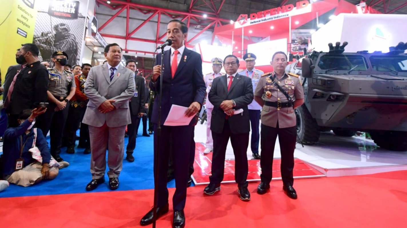 Presiden Joko Widodo memberikan keterangan kepada awak media usai meninjau Indo Defence 2022 Expo & Forum yang digelar di JIEXPO Kemayoran, Jakarta, pada Rabu, 2 November 2022. FOTO: BIRO PERS SETPRES