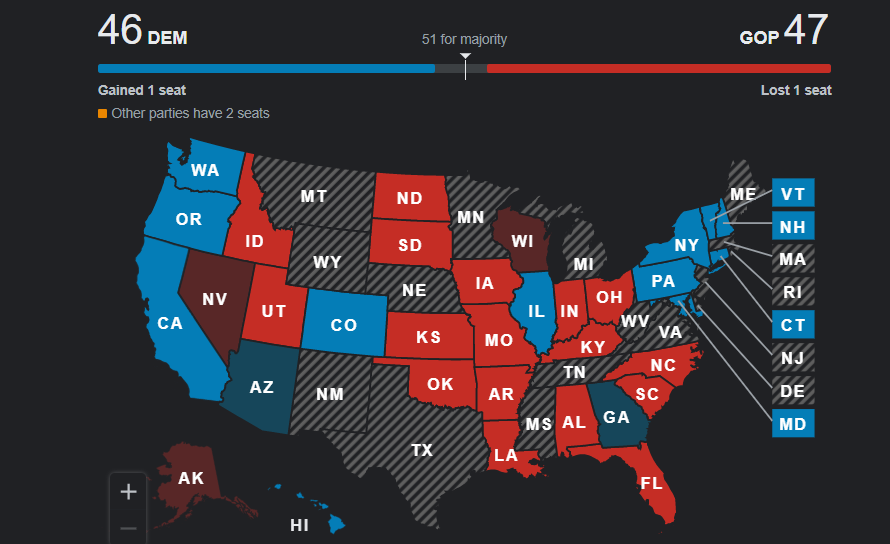 Perhitungan sementara menunjukkan Partai Republik unggul atas Partai Demokrat dalam perebutan kursi DPR. Sedangkan dalam perebutan kursi Senat, kedua partai tersebut dalam posisi imbang di angka 48 kursi, sementara memperebutkan empat kursi sisanya.