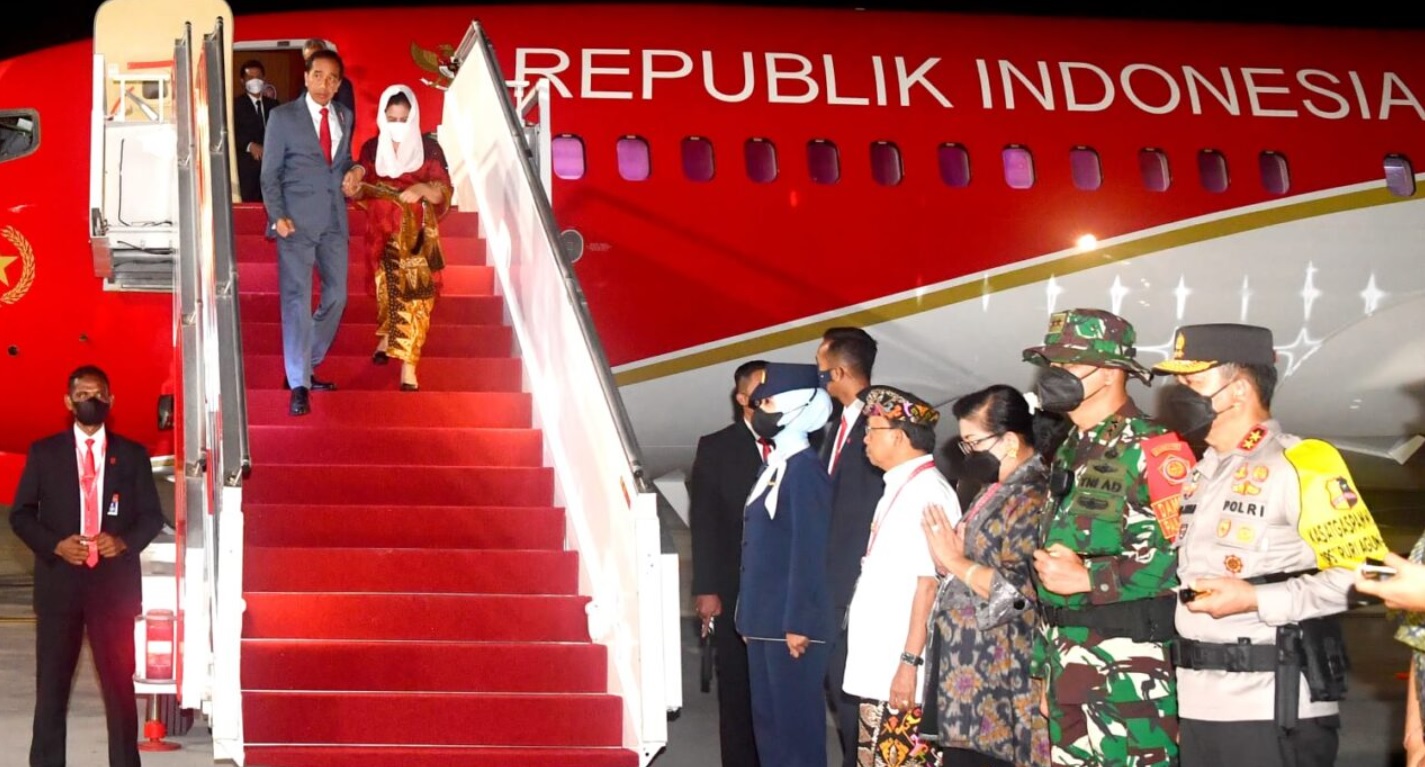 (Vibizmedia-Nasional) Presiden Joko Widodo dan Ibu Iriana Joko Widodo tiba di Tanah Air, pada Minggu, 13 November 2022 setelah menempuh penerbangan selama kurang lebih 3 jam dari Bandara Internasional Phnom Penh, Kamboja dengan menggunakan Pesawat kepresidenan Indonesia-1 di Bandara Internasional I Gusti Ngurah Rai, Kabupaten Badung, Provinsi Bali sekitar pukul 19.20 WITA.