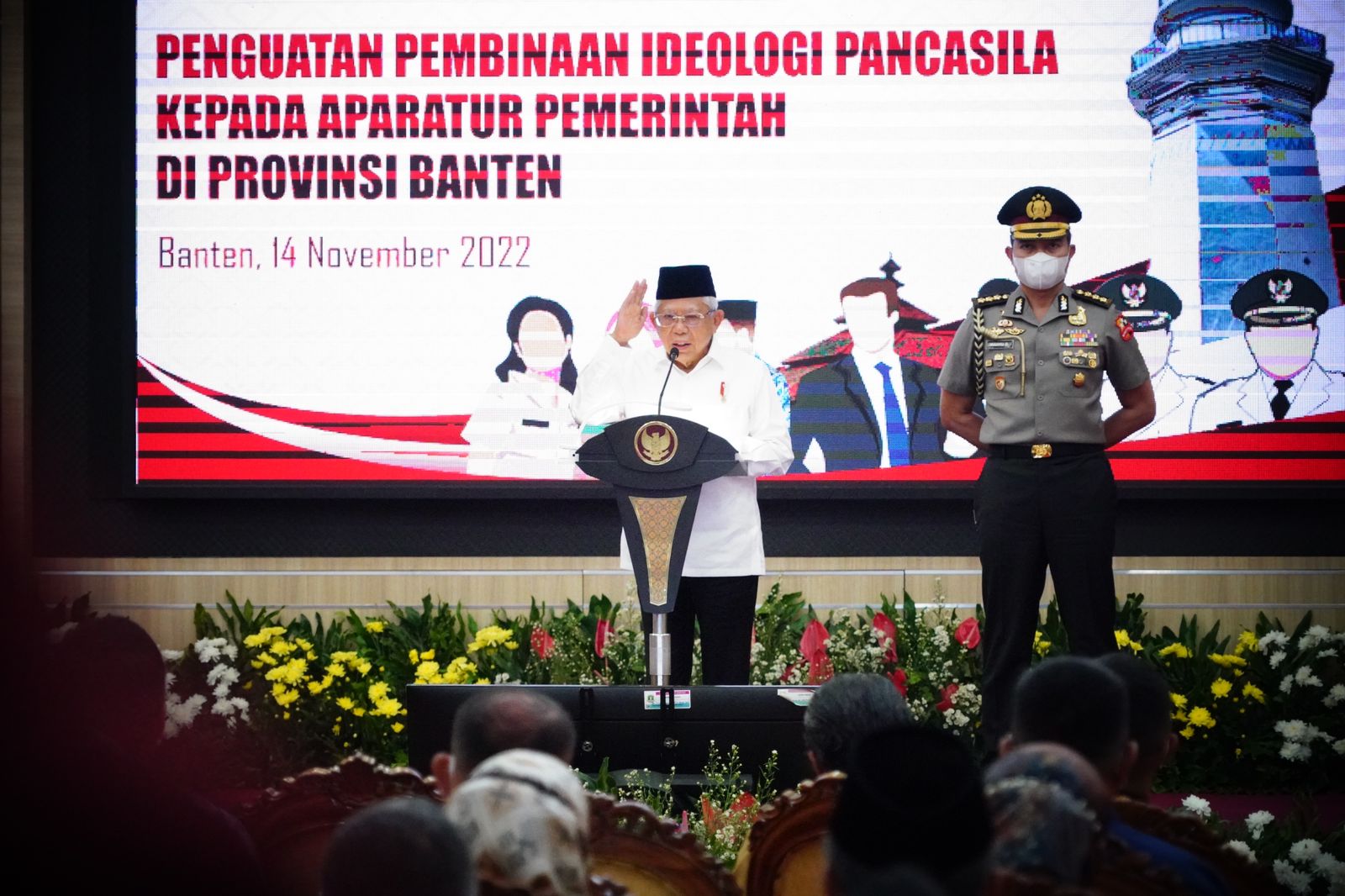 “Nilai-nilai luhur Pancasila harus terinternalisasi pada jiwa, pola pikir, dan perilaku kinerja seluruh ASN,” tegas Wakil Presiden (Wapres) K.H. Ma’ruf Amin dalam acara Penguatan Pembinaan Ideologi Pancasila Kepada Aparatur Pemerintah, Pendopo Gubernur Provinsi Banten, Serang, Banten, Senin (14/11/2022).