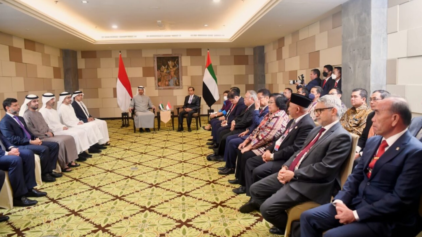 Presiden Joko Widodo bertemu dengan Presiden Persatuan Emirat Arab (PEA) Sheikh Mohammed bin Zayed Al Nahyan (MBZ) di sela-sela acara B20 Summit di Bali Nusa Dua Convention Center (BNDCC), Kabupaten Badung, Senin, 14 November 2022. FOTO: BIRO PERS SETPRES