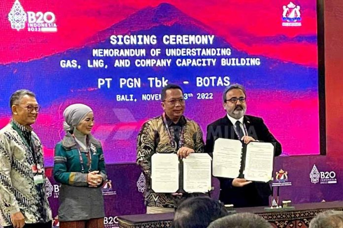 PGN dan BOTAS menandatangani Memorandum of Agreement (MOU) pada Minggu, (13/11/2022). Penandatanganan dilakukan oleh Direktur Utama PT PGN Tbk M. Haryo Yunianto dan BOD Member of BOTAS Corporation, Kerim Taşkiran, disaksikan oleh Menteri ESDM RI, Arifin Tasrif, Direktur Utama PT Pertamina (Persero), Nicke Widyawati, Ketua Kadin, Arsjad Rasjid, & Ketua B20, Shinta Widjaja Kamdani.