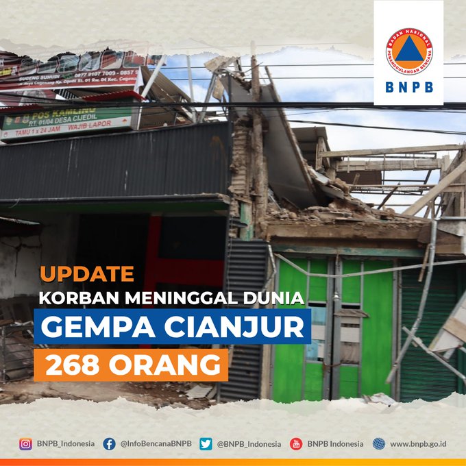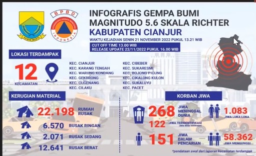 Data sementara hingga Selasa (22/11) pukul 17.00 WIB, jumlah korban meninggal dunia mencapai 268 jiwa, 122 sudah terindentifikasi.