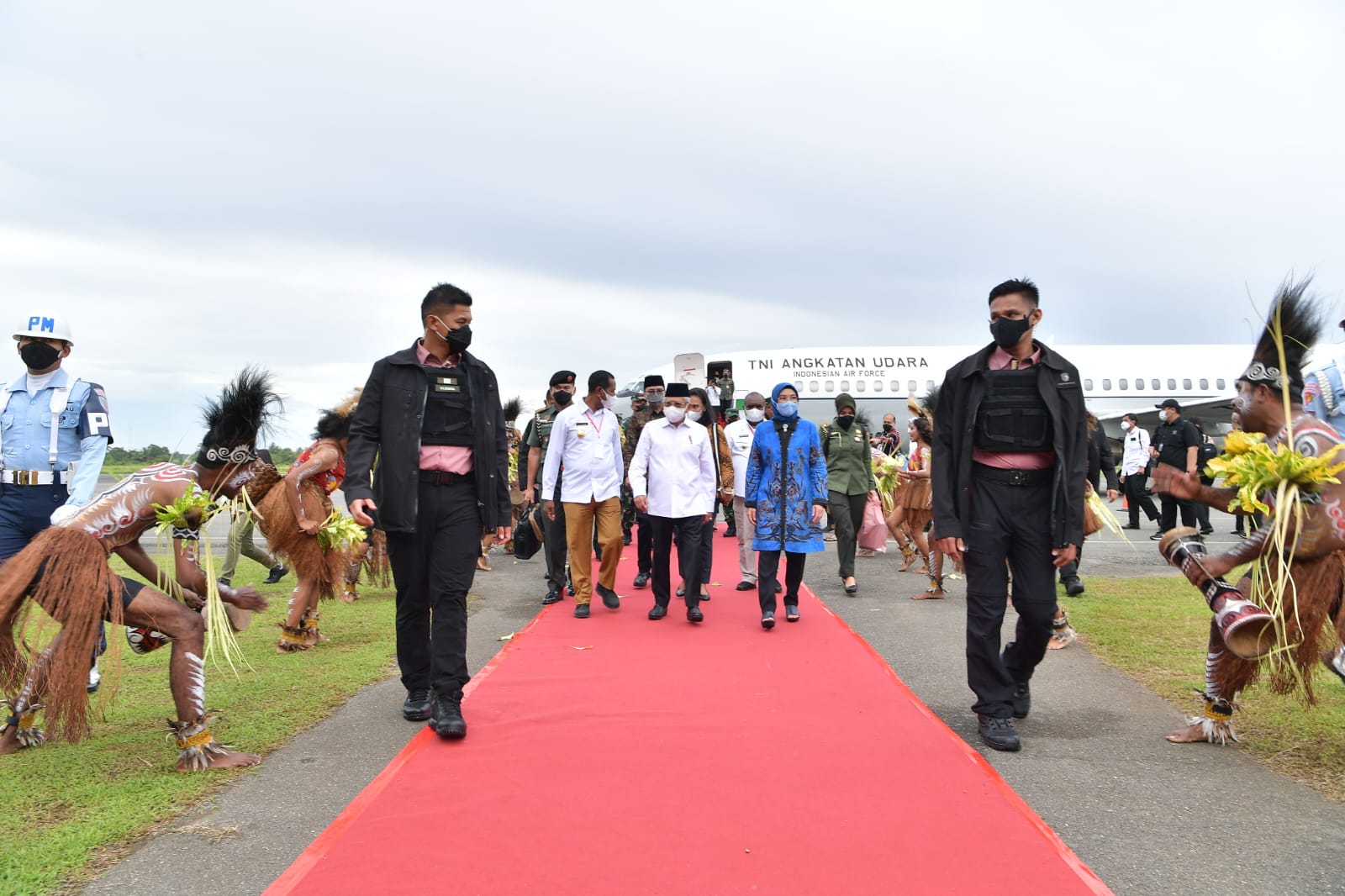 Di tangga pesawat, Wapres disambut oleh Penjabat (Pj.) Gubernur Papua Selatan Apolo Safanpo beserta segenap Anggota Forum Koordinasi Pimpinan Daerah Provinsi Papua Selatan. Tampak pula barisan muda mudi berpakaian adat Papua yang turut menyambut kedatangan Wapres dengan Tarian Selamat Datang yang diiringi alat musik Tifa khas Papua.
