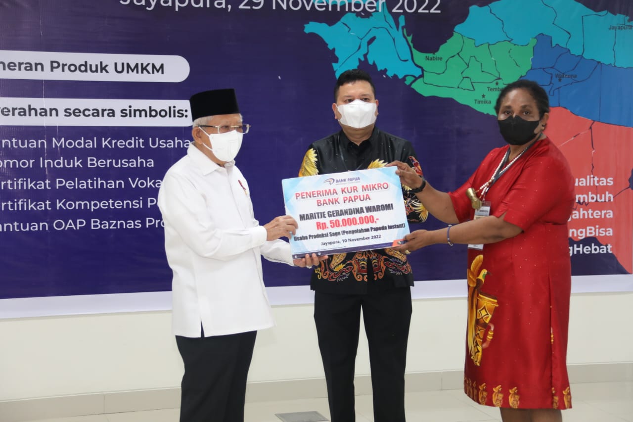 Tidak hanya meninjau berbagai produk UMKM, pada kesempatan ini Wapres juga menyerahkan bantuan modal usaha berupa Kredit Usaha Rakyat (KUR) dari Bank Papua, Bank Mandiri, BRI, dan BNI kepada para pelaku UMKM.
