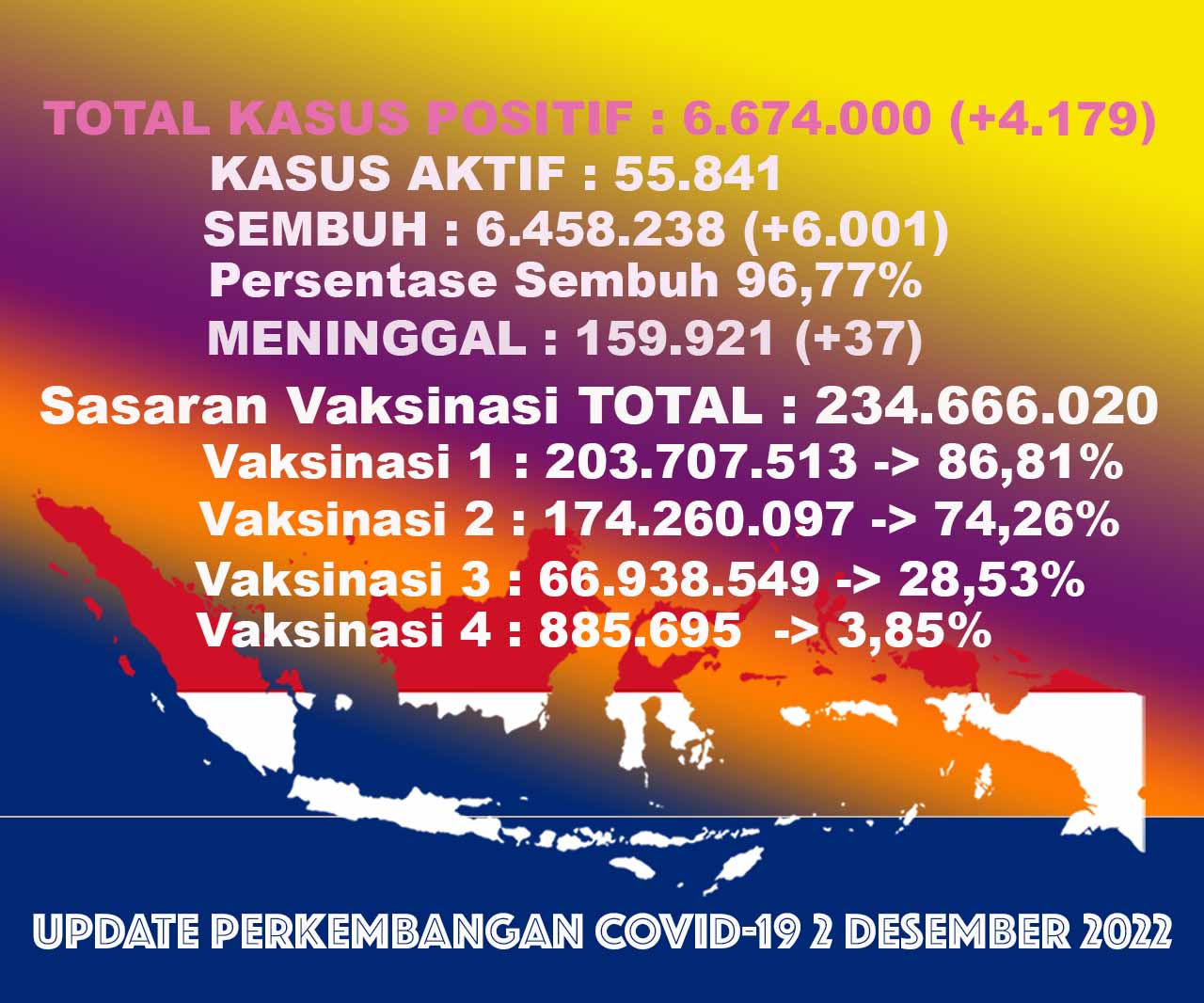 (Vibizmedia – Nasional) Berikut adalah angka akumulatif perkembangan data kasus Covid-19 dari seluruh Indonesia hingga tanggal 2 Desember 2022.