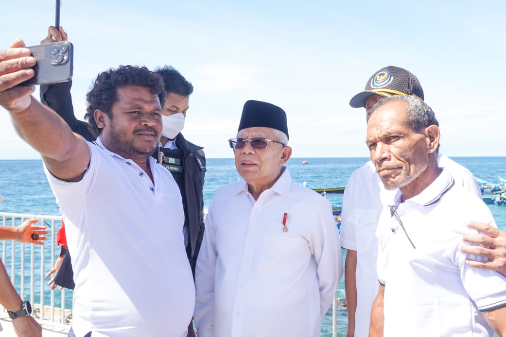 Wakil Presiden (Wapres) K.H. Ma’ruf Amin memenuhi permintaan dua nelayan, bernama Erkanus Binwasef dan Jackson Mansnembra untuk membuat video blogging (vlog) bersama, pada Jumat (02/12/2022). (Foto: BPMI Setwapres)