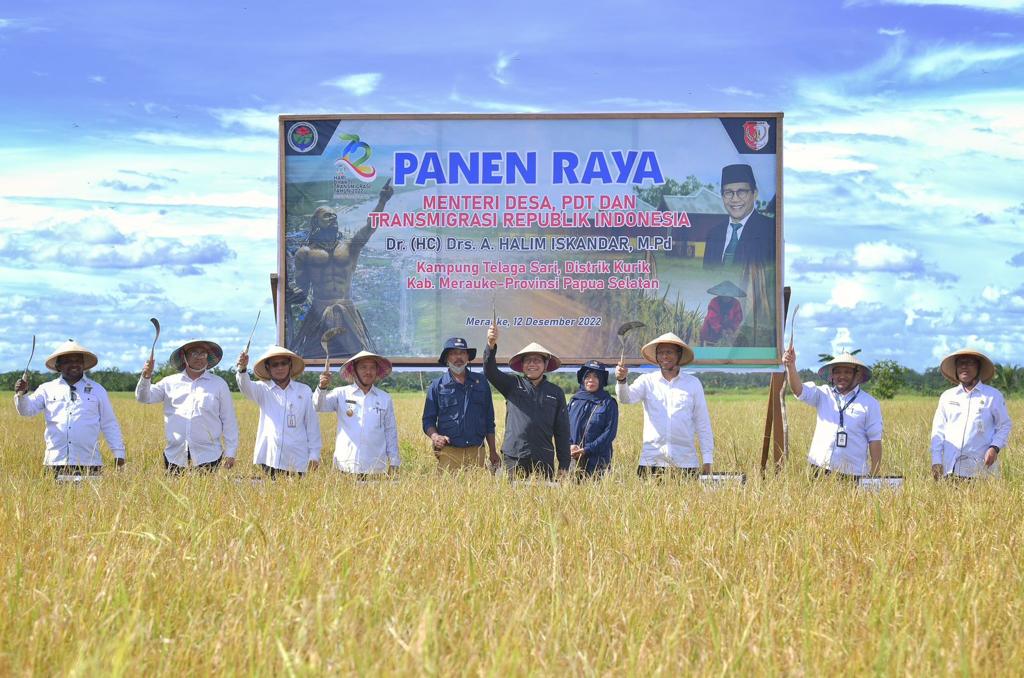 (Vibizmedia-Nasional) Menteri Desa, Pembangunan Daerah Tertinggal, dan Transmigrasi Abdul Halim Iskandar melakukan panen raya padi jenis Inpari IR Nutri Zinc di Kampung Telagasari Distrik Kurik Kabupaten Merauke.