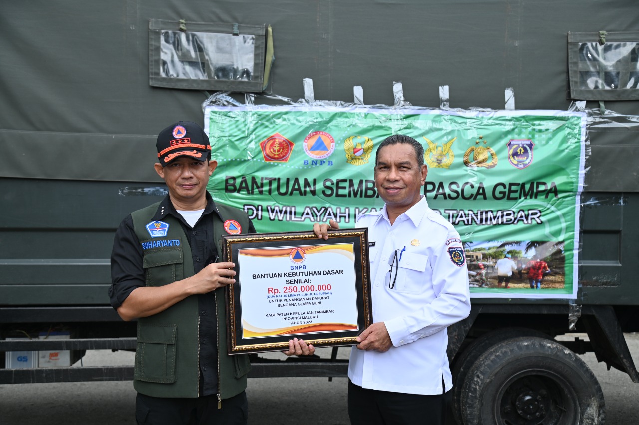 Bantuan yang diserahkan secara simbolis oleh Kepala BNPB Letjen TNI Suharyanto dalam Rapat Koordinasi Penanganan Bencana Maluku di VIP Bandara Internasional Pattimura, Kota Ambon, Provinsi Maluku, pada Kamis, 12 Januari 2023 tersebut terbagi atas bantuan ke Pemprov Maluku senilai 500 juta, 250 juta untuk Pemerintah Kabupaten Kepulauan Tanimbar (KKT) dan 250 juta ke Pemerintah Kabupaten Maluku Barat Daya (MBD).