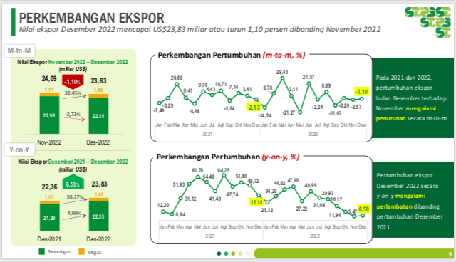 “Ekspor nonmigas Desember 2022 mencapai US$22,35 miliar, turun 2,73 persen dibanding November 2022, sementara naik 4,99 persen jika dibanding ekspor nonmigas Desember 2021,” kata Margo.