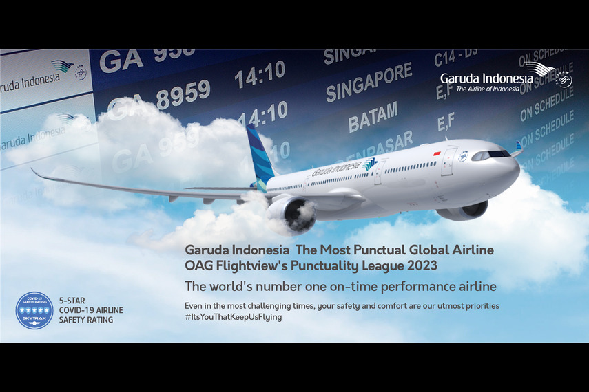 Melansir data Punctuality League 2023 oleh OAG Flight View, Garuda Indonesia berhasil mencatatkan capaian tingkat ketepatan waktu sebesar 95,63 persen, yang sekaligus mencatatkan capaian tingkat ketepatan waktu tertinggi yang pernah diraih Perusahaan pada pemeringkatan tersebut sejak 2020 lalu.