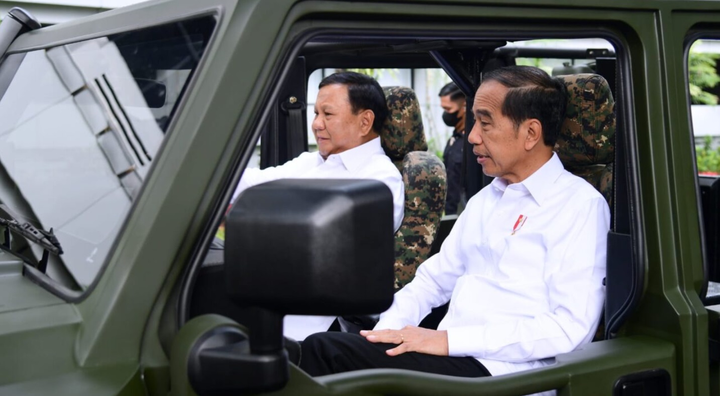 Dalam mobil yang dikendarai langsung oleh Menteri Pertahanan Prabowo Subianto, Presiden Jokowi meninjau pameran alat utama sistem pertahanan (alutsista) yang merupakan bagian dari rangkaian acara rapat pimpinan.