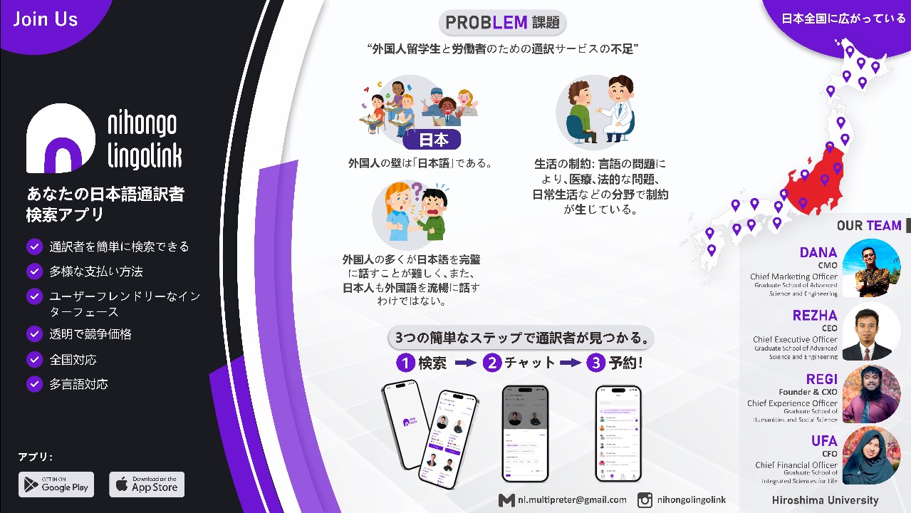 Mereka berhasil mengusung ide untuk pembuatan aplikasi revolusioner yang disebut “The Nihongo Lingolink Multipreter Applications” atau disingkat sebagai “The NLM Apps.” Aplikasi ini dibuat dengan tujuan memudahkan pengguna, terutama orang asing, menemukan penerjemah bahasa Jepang profesional yang sesuai dengan kebutuhan mereka.