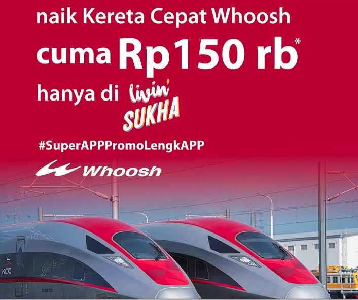 Dengan promo tersebut, tiket Kereta Cepat Whoosh yang semula Rp300.000 bisa dibeli dengan harga Rp150.000 saja, bagi seluruh nasabah Bank Mandiri yang menggunakan aplikasi Livin’ by Mandiri.