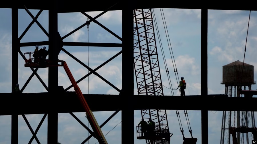 Para pekerja membangun kerangka pabrik baterai Panasonic EV senilai $4 miliar, 18 Mei 2023, dekat DeSoto, Kansas, AS. (Foto: AP)