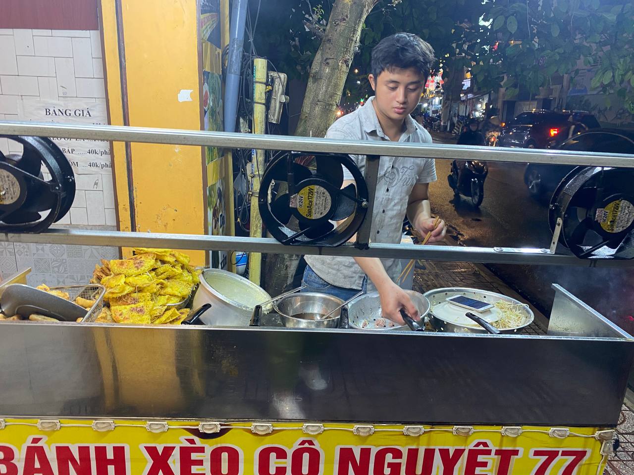Banh Xeo pancake goreng gurih Vietnam yang terbuat dari tepung beras, air atau santan kelapa, dan bubuk kunyit. Beberapa isian umum termasuk: daging sapi, udang, bawang hijau potong dadu, kacang hijau, dan tauge. Bánh xèo juga disajikan dengan selada, mint, basil Thailand, dan mint ikan.