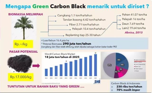 Jika diolah menjadi carbon black dapat menghasilkan sekitar 3 juta ton carbon black. Riset teknologi produksi carbon black dari biomassa kelapa sawit merupakan hal yang sangat menjanjikan untuk meningkatkan ekspor Indonesia.