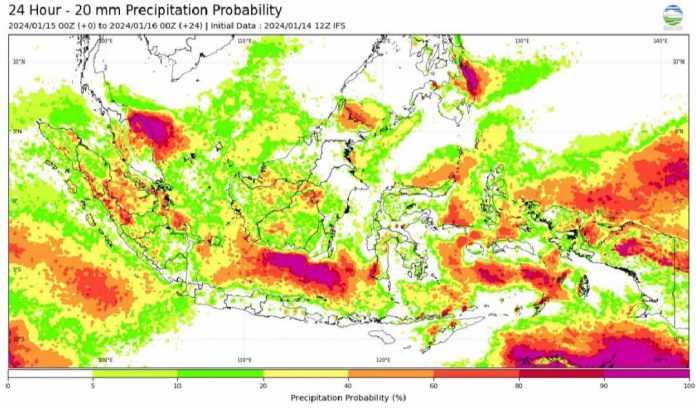 “Cuaca ekstrem itu dapat terjadi selama periode puncak musim hujan yaitu di Januari dan Februari 2024. Potensi hujan lebat hingga sangat lebat, angin kencang, dan gelombang tinggi masih memiliki peluang yang tinggi terjadi di sebagian besar wilayah Indonesia,” ungkap Kepala BMKG, Dwikorita Karnawati, pada Selasa (16/1/2024).