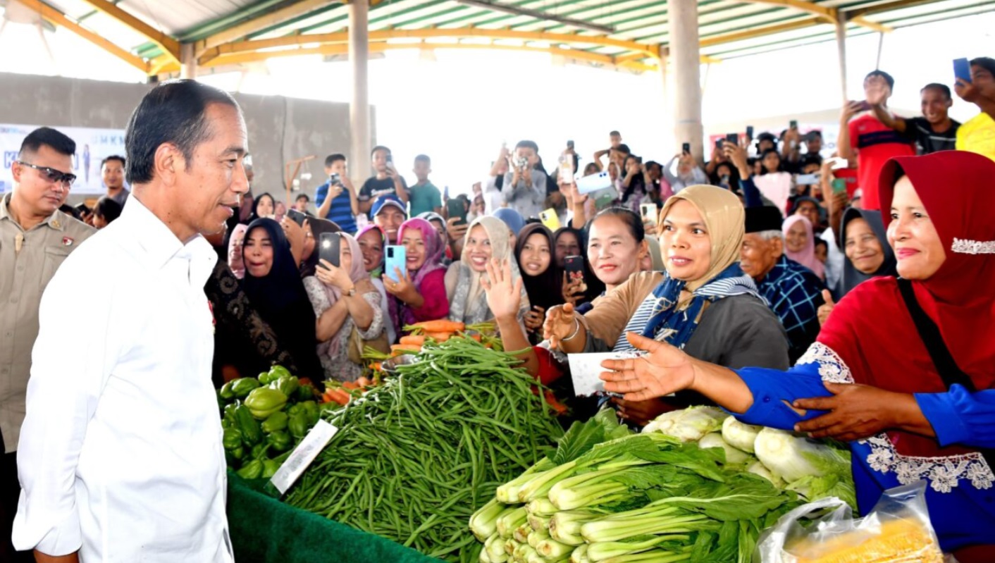 (Vibizmedia-Nasional) Presiden Joko Widodo didampingi Menteri Pekerjaan Umum dan Perumahan Rakyat Basuki Hadimuljono, Menteri Kesehatan Budi Gunadi Sadikin, Gubernur Jambi Al Haris, dan Pj. Bupati Merangin Mukti meninjau langsung ketersediaan dan harga sejumlah bahan pokok yang ada di Pasar Rakyat Merangin, Kabupaten Merangin dinilai cukup stabil dan baik, pada Rabu, 3 April 2024.