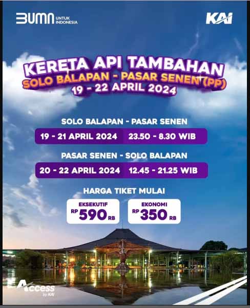 Disampaikan juga bahwa jadwal keberangkatan KA tambahan tersebut terbagi menjadi dua. Khusus tanggal 19 -21 April 2024 untuk relasi Solo Balapan – Pasar Senen sementara tanggal 20 – 22 April 2024 untuk relasi Pasar Senen – Solo Balapan.