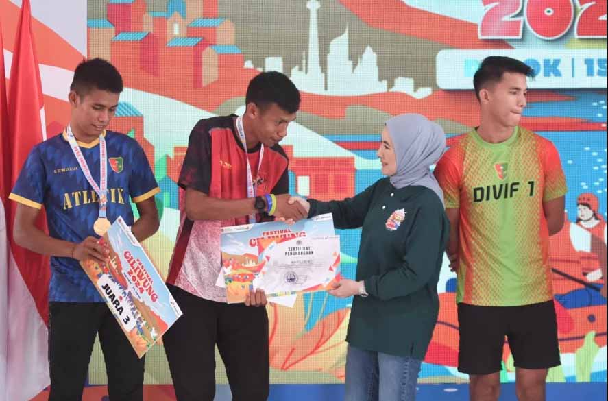 Direktur Utama Pertamina Nicke Widyawati menyerahkan hadiah pada Pelari di acara Festival Ciliwung (15/6). Pertamina turut menyumbang bibit pohon dan perahu karet untuk digunakan di Sungai Ciliwung. (Foto: PT Pertamina (Persero))