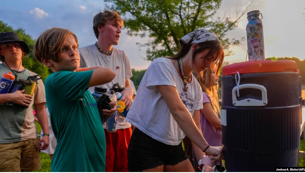 Pemandu kemping Izzy Kellar dari Dayton, Ohio, mengisi botol air peserta kemping, Kamis, 20 Juni 2024, di YMCA Camp Kern di Oregonia, Ohio. (Foto: AP)