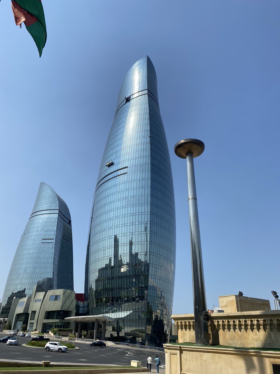 Desain khas Baku, arsitektur unik, dan desain tidak biasa. Menara-menara ini sangat tinggi dan besar sehingga orang dapat melihat kemegahan dan keindahannya dari kejauhan. Pada malam hari, menara-menara ini menampilkan pertunjukan cahaya megah yang menampilkan efek api dan pengibaran bendera nasional. Tempat yang wajib dilihat, terutama dari jarak jauh di malam hari.