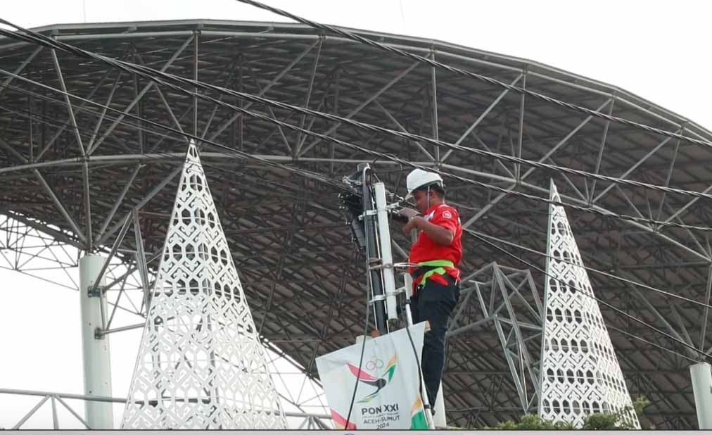 Petugas lapangan TelkomGroup menyiapkan infrastruktur telekomunikasi di salah satu lokasi pertandingan Pekan Olahraga Nasional (PON) XXI Aceh-Sumut 2024 di Banda Aceh. (Foto: Telkom Indonesia)