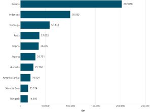 Kanada menjadi negara yang memiliki garis pantai terpanjang di dunia mencapai 202.080 km, yang terbentang dari bagian barat Samudra Pasifik, bagian timur Samudra Atlantik, serta bagian utara Samudra Arktik. Sedangkan, Indonesia menjadi negara kedua dengan garis pantai terpanjang di dunia mencapai 99.083 km, disusul Norwegia dengan garis pantai sepanjang 58.133 km dan Rusia serta Filipina masing-masing sepanjang 37.653 km dan 36.289 km.