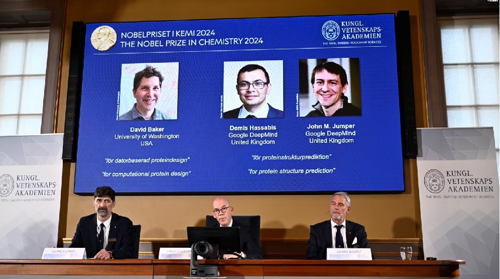 Hadiah Nobel bidang kimia dianugerahkan kepada tiga ilmuwan yang selama ini bekerja keras meneliti protein. Ketiganya adalah David Baker, Demis Hassabis dan John Jumper.(Foto: Voaindonesia)