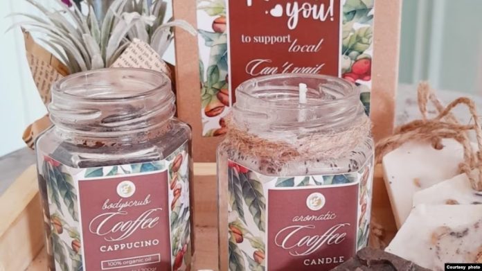 “Teman saya dari komunitas datang. Kenapa dibuang ampas kopinya? Kenapa tidak dibuat lilin, sabun dan lainnya? Nah, dari situlah akhirnya saya waktu itu membuat body scrub (krim penggosok kulit tubuh) dulu, lalu lilin. Akhirnya ruangan jadi wangi kopi. Karena banyak, akhirnya jadi souvenir (cindera mata),” tuturnya.