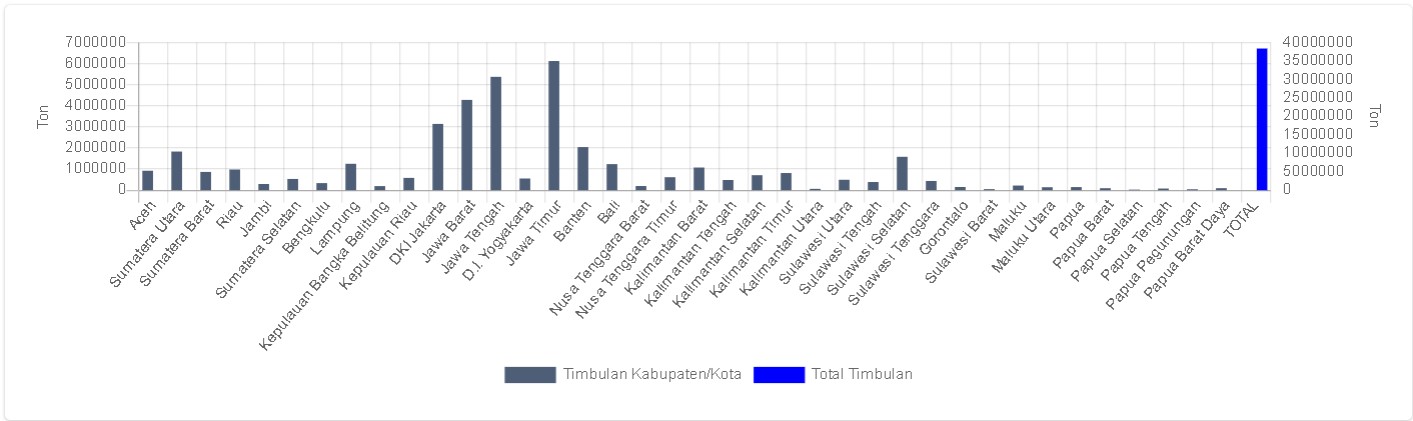 Grafik ini menunjukkan jumlah timbulan sampah di berbagai provinsi di Indonesia, diukur dalam satuan ton. Provinsi seperti Jawa Barat, Jawa Tengah, DKI Jakarta, dan Jawa Timur memiliki timbulan sampah yang sangat tinggi dibandingkan provinsi lain disebabkan oleh jumlah populasi yang besar dan tingkat urbanisasi yang tinggi di wilayah tersebut.