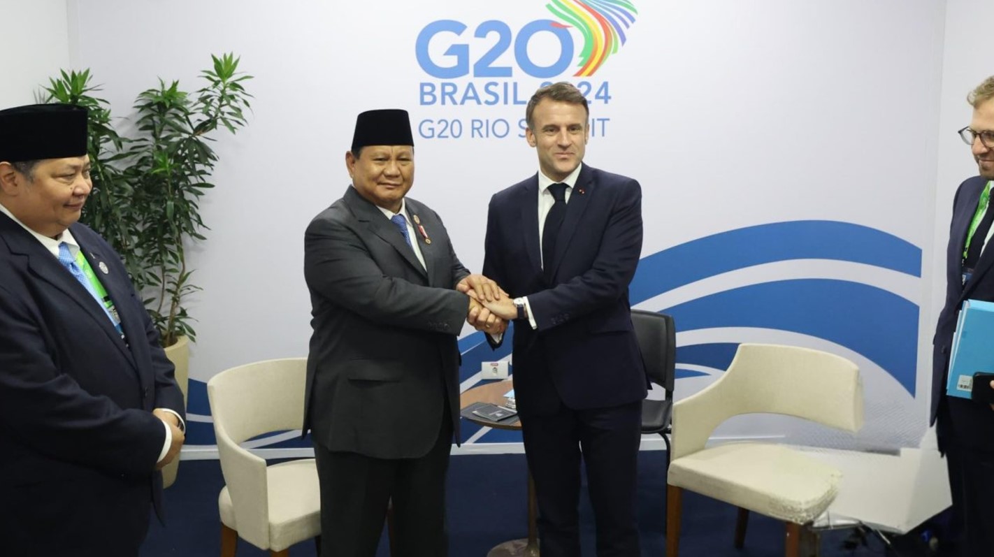 (Vibizmedia-Nasional) Di sela-sela Konferensi Tingkat Tinggi (KTT) G20 di Brasil, Presiden Prabowo Subianto didampingi Menteri Koordinator Bidang Perekonomian Airlangga Hartarto, Menteri Luar Negeri Sugiono, Menteri Keuangan Sri Mulyani, dan Sekretaris Kabinet Teddy Indra Wijaya mengadakan pertemuan bilateral dengan Presiden Prancis Emmanuel Macron, untuk memperkuat hubungan bilateral antara Indonesia dan Prancis di berbagai sektor, pada Selasa, 19 November 2024.