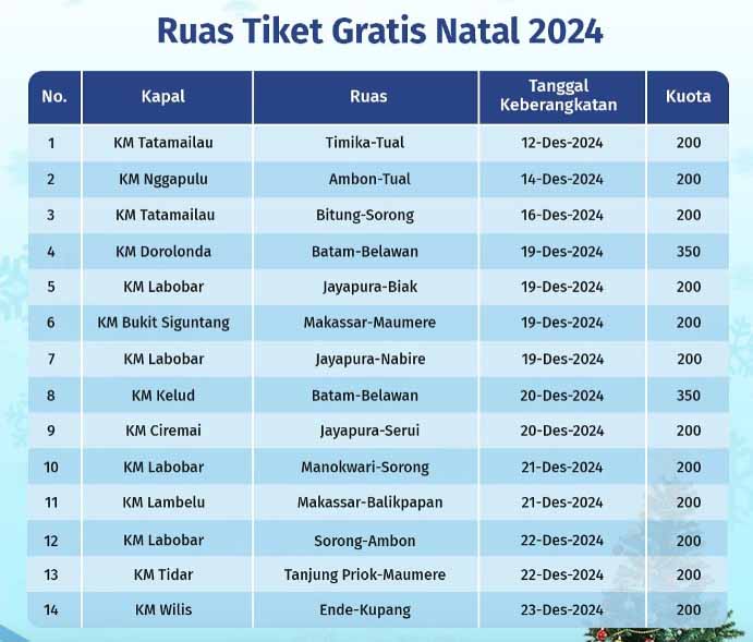 Beberapa kapal disiapkan untuk melayani program ini, salah satunya KM Kelud yang menyediakan kuota terbesar, yaitu 350 tiket gratis untuk rute Batam-Belawan dengan keberangkatan pada 20 Desember 2024.