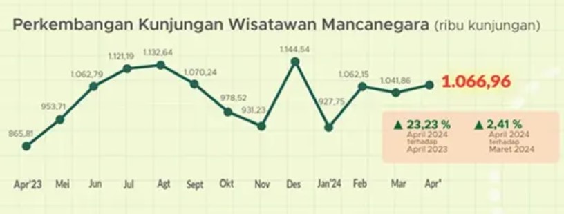 Pada April 2024, kunjungan wisatawan mancanegara (wisman) di Indonesia mencapai 1,07 juta kunjungan. Jumlah ini naik sebesar 2,41 persen dibandingkan Maret 2024 (m-to-m) dan naik 23,23 persen dibandingkan bulan yang sama pada tahun lalu (y-on-y). Wisman yang berkunjung ke Indonesia pada April 2024 didominasi oleh wisman yang berasal dari Malaysia (15,99 persen), Australia (11,99 persen), dan Tiongkok (8,06 persen).