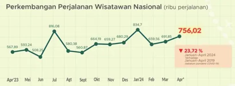 Jumlah perjalanan wisatawan nasional (wisnas) pada April 2024 mencapai 756,02 ribu perjalanan. Jumlah tersebut naik sebesar 9,28 persen bila dibandingkan dengan Maret 2024 (m-to-m) dan naik 33,13 persen dibandingkan bulan yang sama pada tahun sebelumnya (y-on-y). Malaysia menjadi negara tujuan utama wisnas yang paling diminati di bulan April 2024 (33,17 persen) diikuti negara Singapura (16,33 persen), Arab Saudi (10,65 persen), dan Tiongkok (5,44 persen).