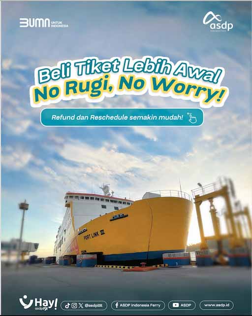 ASDP juga terus mendorong pembelian tiket secara online melalui platform Ferizy, yang memungkinkan pemesanan hingga 60 hari sebelum keberangkatan. Sistem ini, menurut Shelvy, bertujuan memastikan perjalanan lebih terorganisir dan efisien, sekaligus menghindari antrean panjang di pelabuhan.