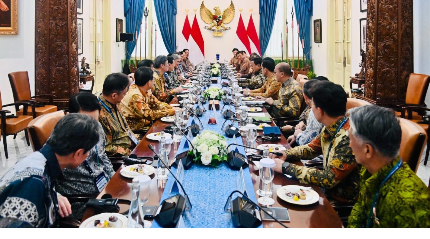(Vibizmedia-Nasional) Presiden Prabowo Subianto didampingi Wakil Presiden Gibran Rakabuming, Menteri Koordinator Bidang Perekonomian Airlangga Hartarto, Menteri Investasi dan Hilirisasi/Kepala BKPM Rosan Roeslani, Menteri Sekretaris Negara Prasetyo Hadi, dan Sekretaris Kabinet Teddy Indra Wijaya menerima kunjungan kehormatan Chairman Lotte Group Shin Dong-bin, bersama delegasi Federation of Korean Industries (FKI) di Istana Merdeka, Jakarta, pada Senin, 28 April 2025.